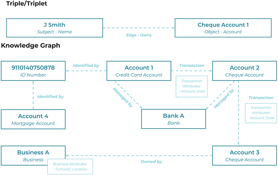 Knooppunten vertegenwoordigen entiteiten zoals personen, bedrijven, bankrekeningen en landen, terwijl randen de relaties tussen deze entiteiten weergeven (waaronder transacties).
