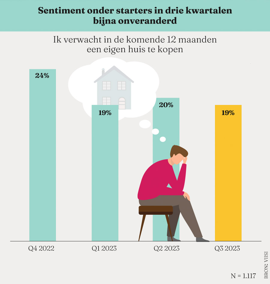 Verder blijkt uit het onderzoek dat het aantal starters in de komende twaalf maanden hun eerste woning verwacht te kopen, dit kwartaal wederom uitkomt op 19% – het lage verwachtingscijfer is daarmee al drie kwartalen achter elkaar niet veranderd.