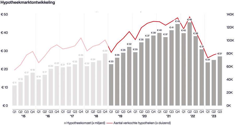 De €26,9 miljard aan hypotheekomzet van het derde kwartaal ligt nog wel ver onder het record van het tweede kwartaal van 2022, waarin de €46 miljard werd aangetikt. De onderzoekers spreken van een “voorzichtig teken van herstel” voor de branche.