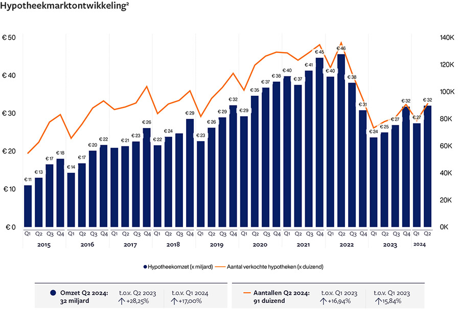 Daarnaast komt uit de hypotheekupdate naar voren dat de trend van een dalende hypotheekomzet onder over- en bijsluiters een halt is toegeroepen. De omzet onder deze groep is dit kwartaal juist ruim gestegen met 26,1% ten opzichte van het tweede kwartaal van 2023.