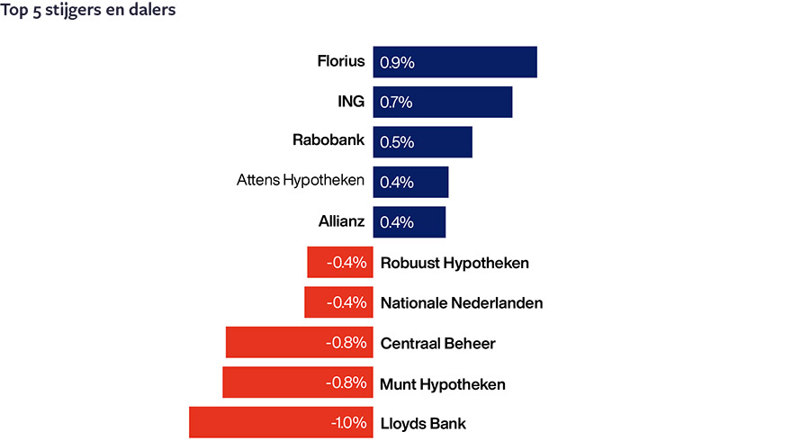 Florius voert in het afgelopen kwartaal de groep stijgers aan met een groei van 0,9 procentpunt. Wel valt op dat de algehele groei onder de top vijf stijgers aanzienlijk lager is dan in het eerste kwartaal van 2024.