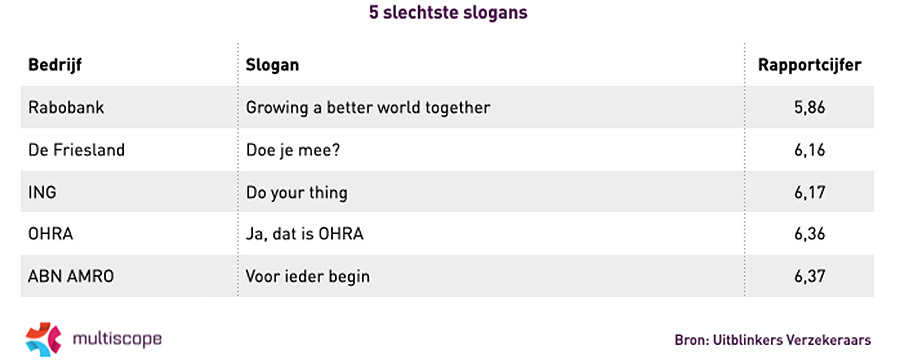Ook de slogans van ING ‘Do your thing’ (6,17) en ABN AMRO ‘Voor ieder begin (6,37) zijn in de top vijf slechtst scorende slogans terug te vinden.