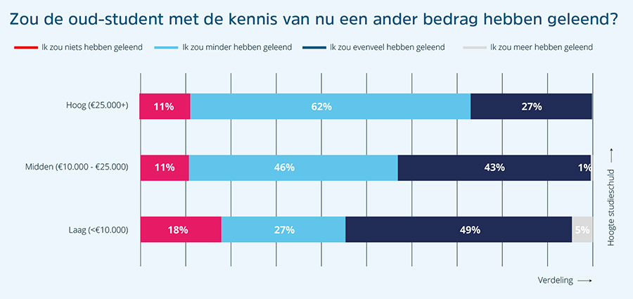 Al gauw komt dan ook naar voren dat afgestudeerden met een hoge studieschuld spijt hebben van het lenen. Zes op de tien zou achteraf gezien minder hebben willen lenen; één op de tien zou zelfs helemaal geen lening zijn aangegaan.