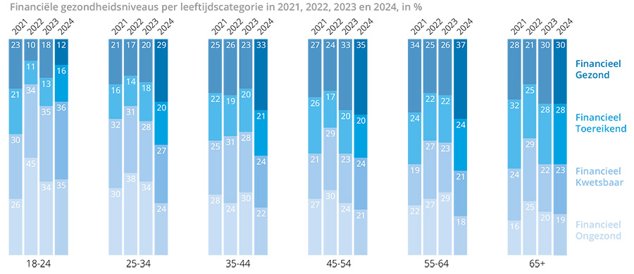 In 2021 beter ging het juist wat beter met jongvolwassen dan vandaag de dag. Indertijd was 56% financieel kwetsbaar (30%) of ongezond (26%). Dat neemt niet weg dat de meerderheid van deze leeftijdscategorie dus al geruime tijd niet financieel gezond is.