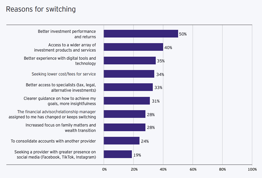 Wereldwijd gebruiken vermogende klanten gemiddeld 2,3 providers, en 32% plant dit aantal verder te verhogen. Onder millenials is het aantal aanbieders dat wordt gebruikt nog hoger. Dit geeft dus indicatie van mogelijk minder sticky klanten dan in het verleden.