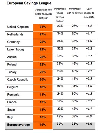 Uit het onderzoek van ING blijkt dat bij 31% van de Britten het spaargeld toenam, tegenover het Europese gemiddelde van 19%. Nederland neemt met 27% de tweede plek in. Onderaan de lijst met Europese landen staat Italië. De Italiaanse consumenten hebben hun spaargeld het afgelopen jaar met 10% zien toenemen.