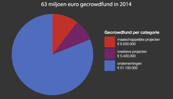 De afgelopen jaren is crowdfunding in Nederland steeds populairder geworden, getuige de forse stijging van het totaal opgehaalde financieringsbedrag in ons land. Douw en Koren, een adviesbureau gespecialiseerd in crowdfunding, liet in 2013 al zien dat de markt ten opzichte van het jaar ervoor meer dan verdubbeld was – van €14 miljoen naar €32 miljoen. In juli vorig jaar – op dat moment stond de teller op €23 miljoen – luidde de prognose van het bureau dat de markt in 2014 waarschijnlijk weer zou gaan verdubbelen. Een terechte prognose want in 2014 groeide de markt naar zo’n €63 miljoen, opnieuw (nagenoeg) een verdubbeling dan het jaar ervoor.