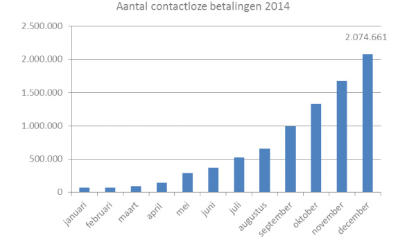 Sinds de introductie begin 2014 pinnen consumenten steeds vaker contactloos. Bijna 8,3 miljoen aankopen werden in 2014 contactloos gepind. Inmiddels zijn er meer dan 8 miljoen contactloze betaalpassen in omloop. Consumenten kunnen hiermee bij 56.000 betaalautomaten in Nederland (dat is 1 op de 6) contactloos pinnen.