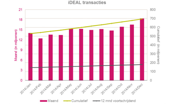 In 2014 werd 180,2 miljoen keer met iDEAL afgerekend, een stijging van 26,4% ten opzichte van 2013. Sinds de marktintroductie eind 2005 bedraagt het totaal aantal iDEAL-betalingen 695,4 miljoen. Het toenemend gebruik van smartphones en tablets levert een belangrijke bijdrage aan deze groei. Daarnaast is er met name een stijging van het aantal iDEAL-betalingen te zien buiten de traditionele e-commerce zoals bij donaties aan goede doelen of het betalen van facturen en boetes. Ook neemt de interesse voor iDEAL toe doordat Nederlandse klanten steeds vaker bij buitenlandse webwinkels met iDEAL kunnen betalen. Uit onderzoek blijkt tevens dat Nederlandse consumenten meer dan de helft (53%) van alle online aankopen in de eerste helft van 2014 met iDEAL hebben afgerekend.