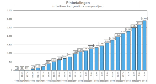 Nederlandse consumenten pinden in 2014 meer dan ooit. Het aantal pinbetalingen bereikte in 2014 met 2,913 miljard opnieuw een record. Ten opzichte van 2013 is dit een groei van 9,5%. Net zoals voorgaande jaren zat de sterkste groei in de pinbetalingen tussen € 0 tot € 10. Het aantal pinbetalingen in dit segment steeg het afgelopen jaar met 17,9% tot een totaal van ruim 1 miljard. Dat is meer dan een derde (37%) van alle pinbetalingen.