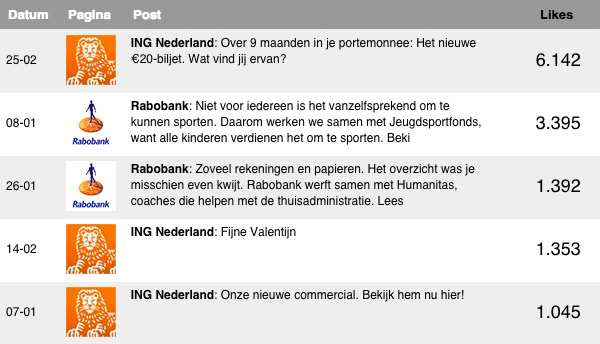 De drie grootbanken waren, gemeten naar het aantal fans, het grootst op Facebook. ING heeft 237.709 fans, 5.268 meer dan eind vorig jaar. Het aantal fans van Rabobank en ABN AMRO stijgt naar 193.344 (+2.258) respectievelijk 77.822 fans (+4.601). Daarmee is ABN AMRO relatief de grootste stijger op Facebook (+6%).