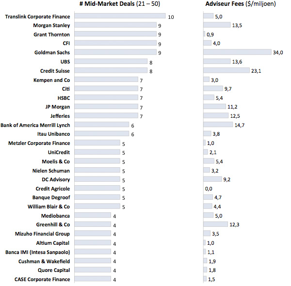 Rabobank mag zich – na accountants- en advieskantoor BDO – met 42 deals binnen de mid-market de op een na grootste dealmaker in de Benelux noemen. In 2013 stond de coöperatieve bank met minder deals (35) nog op de eerste plek. Rabobank wordt gevolgd door de Corporate Finance praktijken van Big Four kantoren KPMG en PwC, en de zakenbank takken van ABN AMRO en ING. Met een toename van 13 deals behoort ABN AMRO tot een van de snelste groeiers in de lijst – afgelopen jaar stond de bank op de 14de plek. In de top 20 staan nog zeven overige banken: Rothschild, BNP Paribas, Leonardo & Co, Deutsche Bank, Lincoln International, NIBC en Lazard.