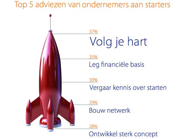De wens om eigen baas te zijn, om de eigen passie te volgen en het niet kunnen vinden van een baan in loondienst zijn voor mensen de belangrijkste drijfveren om een eigen bedrijf te starten. Er zijn maar liefst 265.000 Nederlanders die met het serieuze plan rondlopen om voor zichzelf te beginnen. Belangrijkste adviezen die startende ondernemers geven aan mensen die ook voor zichzelf aan de slag willen: volg je hart (37%) en zorg voor voldoende geld (35%). Dat blijkt uit onderzoek van onderzoeksbureau GfK in opdracht van de Rabobank onder onder ruim 600 Nederlandse ondernemers die de laatste twee jaar zijn gestart of serieuze plannen hebben in de komende twee jaar te starten.