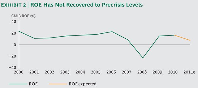 Uit het onderzoek van BCG blijkt dat huidige rendementniveaus nog lang niet terug zijn op de niveaus van voor de crisis. De consultants verwachten zelfs dat Return on Equity (ROE) over 2011 lager zal zijn dan het voorgaande jaar. Belangrijkste oorzaken voor de lagere rendementniveaus zijn de alsmaar toenemende eisen die toezichthouders stellen, de stijging in ICT kosten en de zwakke economische ontwikkeling.