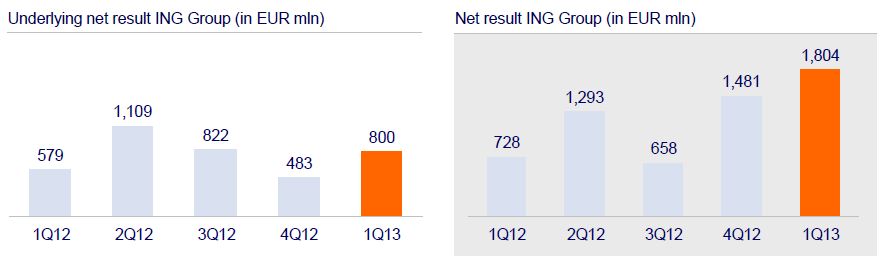 ING Groep heeft in het eerste kwartaal van 2013 een onderliggende nettowinst geboekt van €800 miljoen, een stijging van 38,2% ten opzichte van een jaar geleden. De winststijging is een gevolg van betere rentemarges en de realisatie van besparingsinitiatieven. Daarnaast maakte ING tijdens de presentatie van haar kwartaalcijfers bekend goede voortgang te hebben geboekt met de herstructurering en heeft aangegeven de voorbereidingen voor het afstoten van zijn Europese verzekeringstak te willen verstellen.