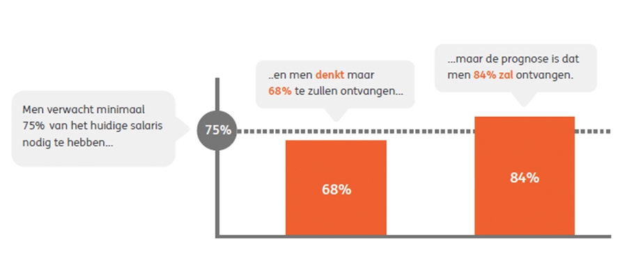 Desondanks gelooft een groot deel van de Nederlanders de 75% niet te halen. Gemiddeld verwachten Nederlanders 68% van hun huidige inkomen te ontvangen als netto pensioeninkomen. Maar uit het onderzoek van ING blijkt dat zij meer zullen krijgen dan dat – namelijk 84% van het huidige inkomen. Volgens ING zorgt deze valse verwachting ervoor dat er Nederlanders zijn die geld overhouden op hun oude dag, terwijl ze op eerdere momenten mogelijk dat geld beter hadden kunnen gebruiken.