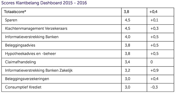 Uit de meest recente versie van het onderzoek, het Klantbelang Dashboard voor de periode 2015-2016, blijkt dat de financiële sector op een aantal gebieden verbetering heeft getoond ten opzichte van vorig jaar. Zo is de kwaliteit van het beleggingsadvies en hypotheekadvies- en beheer bij grote financiële instellingen gestegen en voorzien banken hun klanten van duidelijkere informatie – alle drie de scores stegen met 0,5 punten. De meeste verbetering werd echter gerealiseerd op het gebied van informatieverstrekking aan zakelijke bankklanten – hier steeg de score met 0,9 punten naar 3,2.